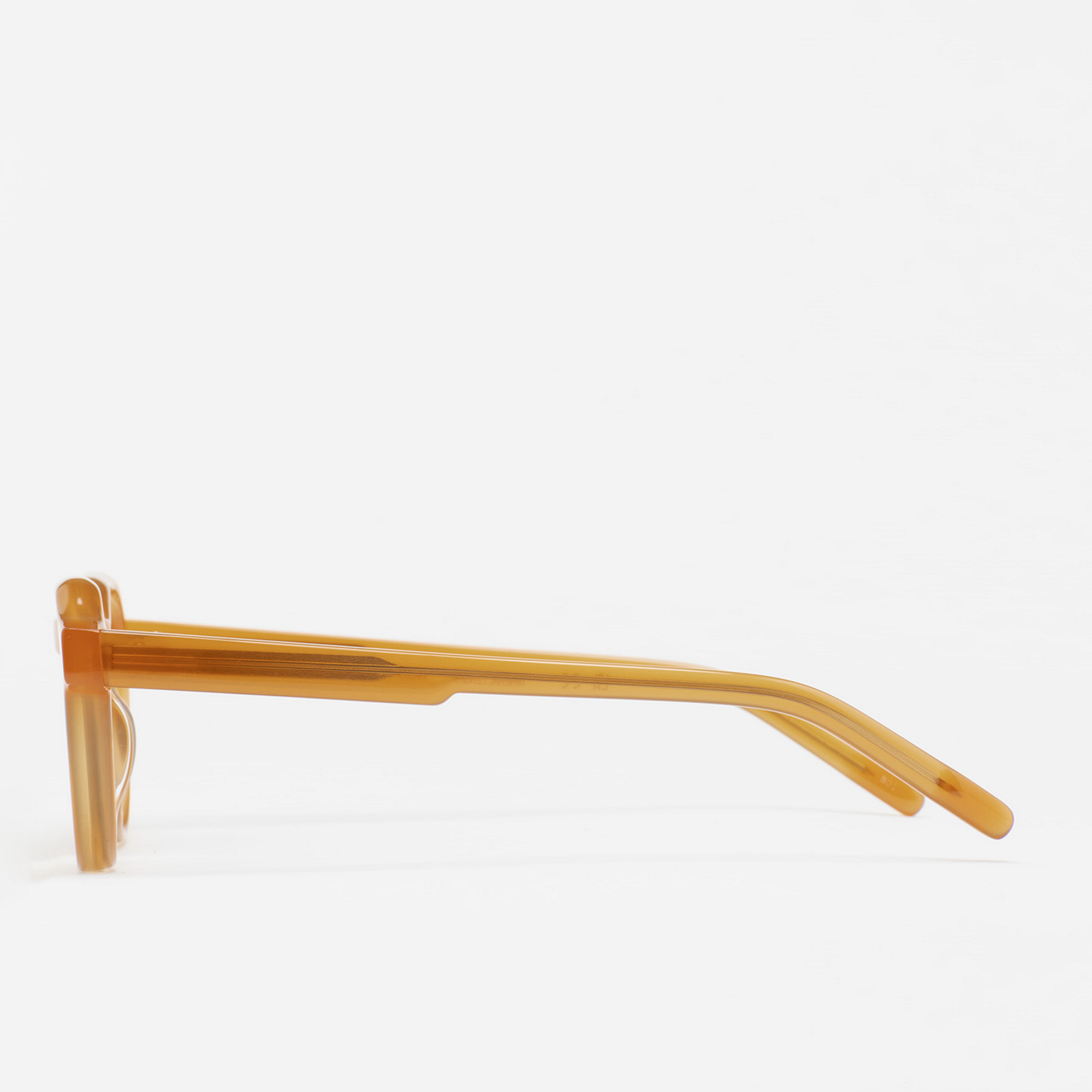 Gafa de sol de forma pantos con ceja plana y fresado alrededor de la lente. Frontal y varillas de acetato ámbar. Lente verde mineral base 2 con 100% protección UV y tratamiento antirreflejante. Lente Categoría 3. Plaquetas de acetato incorporadas. Hecha a mano.