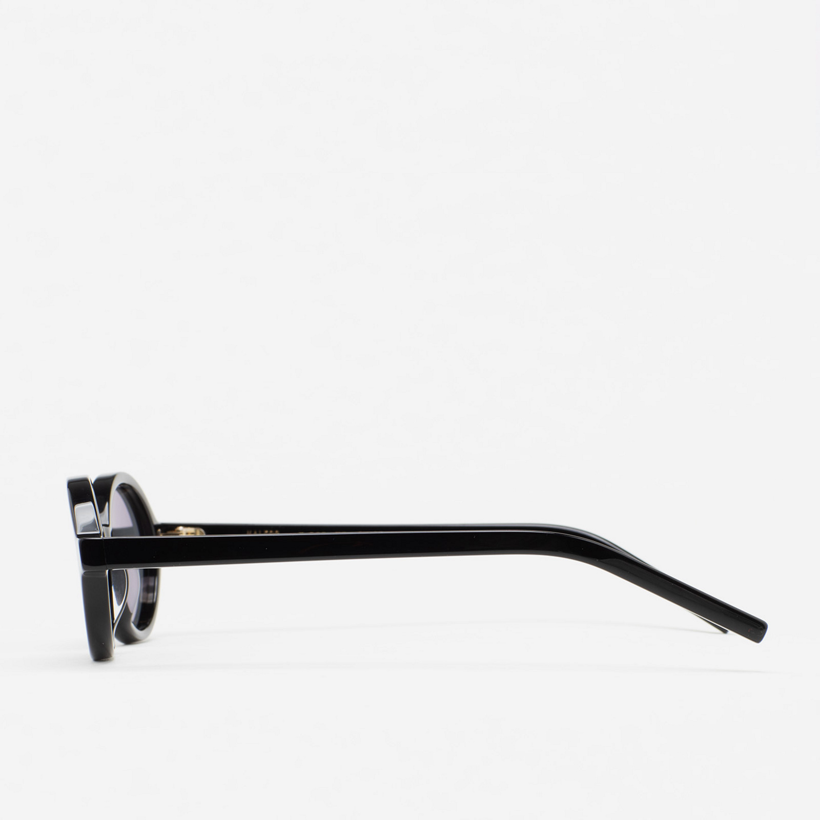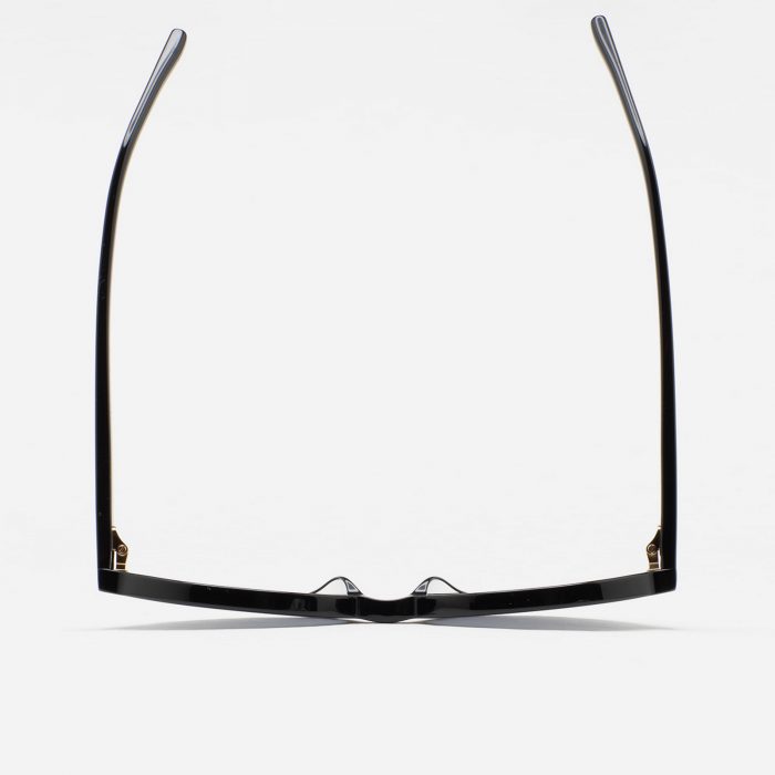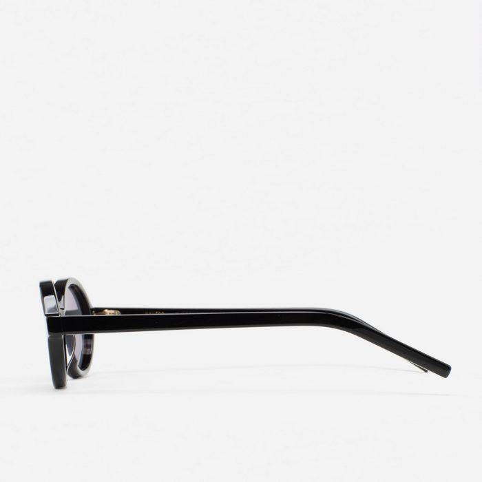 Gafa de sol de forma ovalada. Frontal y varillas de acetato negro. Lente gris degradada base 2 con 100% protección UV y tratamiento antirreflejante. Lente Categoría 3. Plaquetas de acetato incorporadas. Hecha a mano.