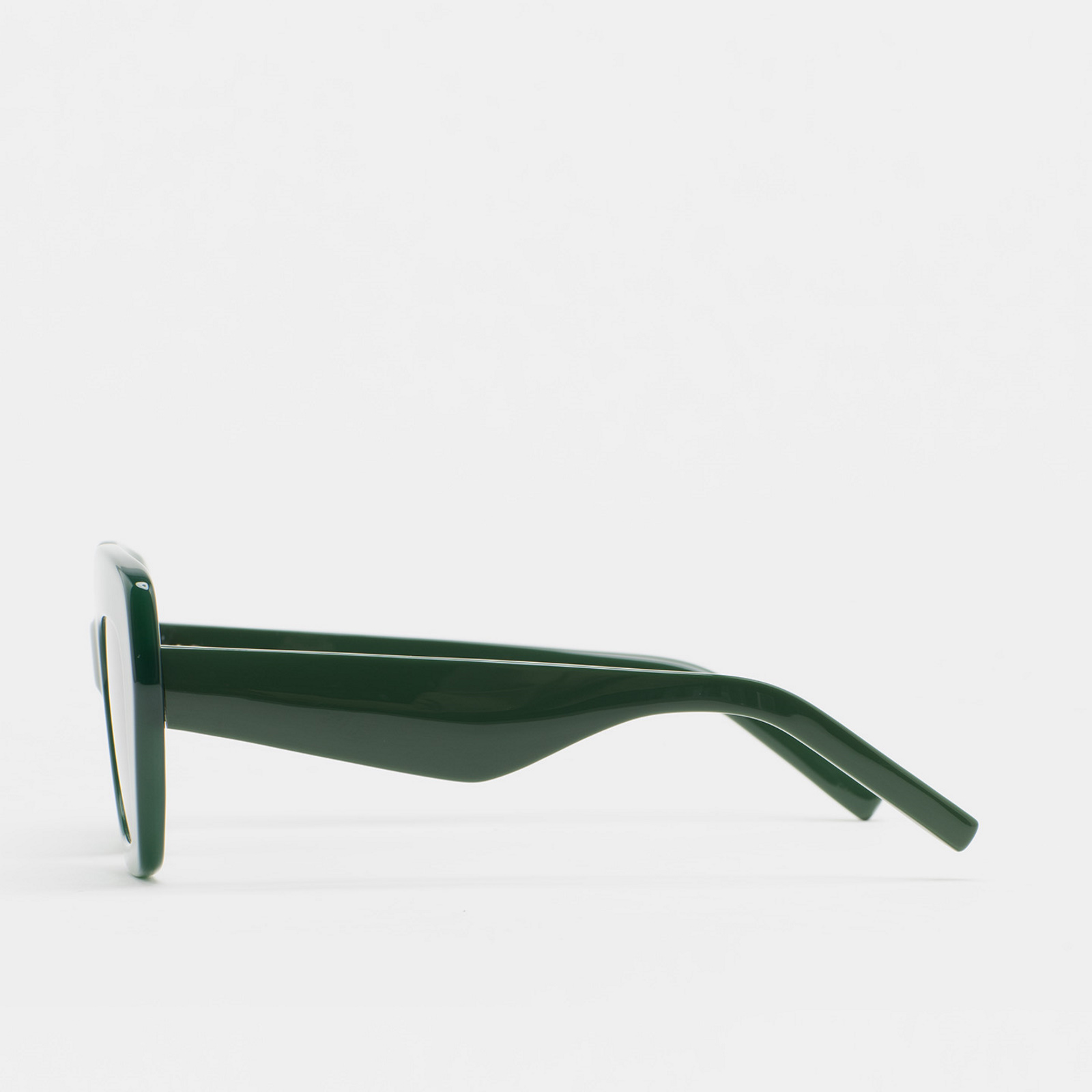 Gafa de sol de forma mariposa. Frontal de acetato verde oscuro translúcido y varillas de acetato verde. Lente verde degradada base 2 con 100% protección UV y tratamiento antirreflejante. Lente Categoría 2. Plaquetas de acetato incorporadas. Hecha a mano.