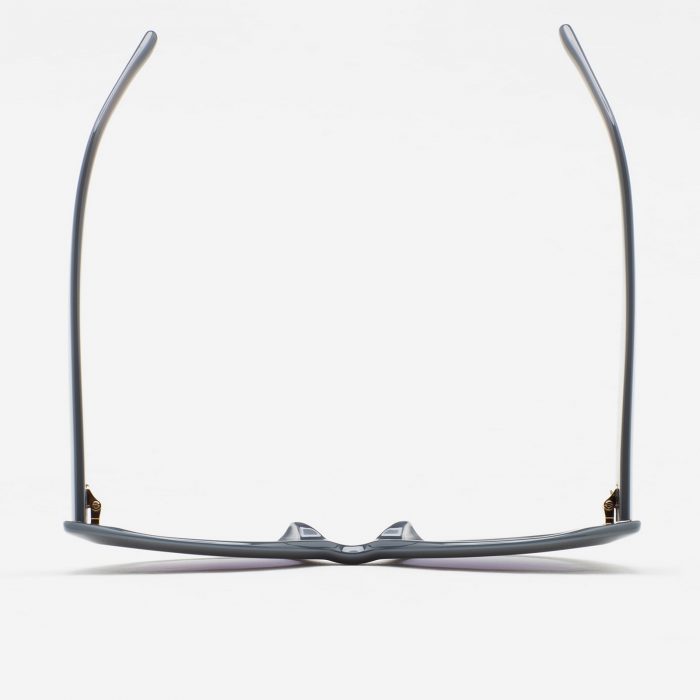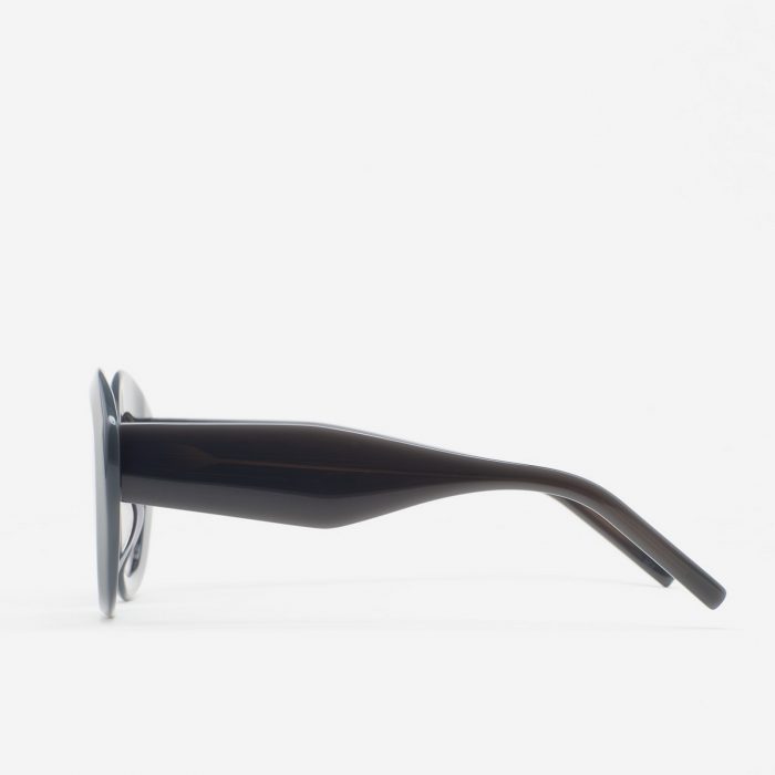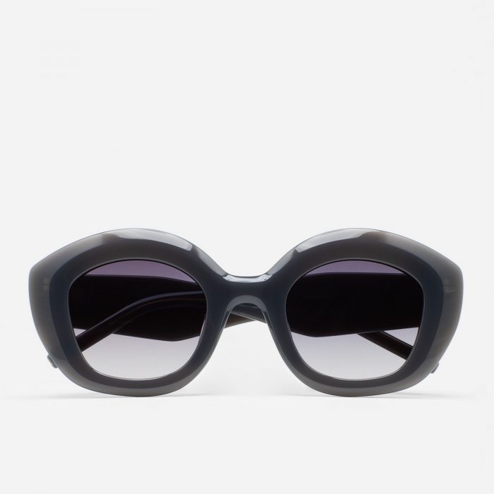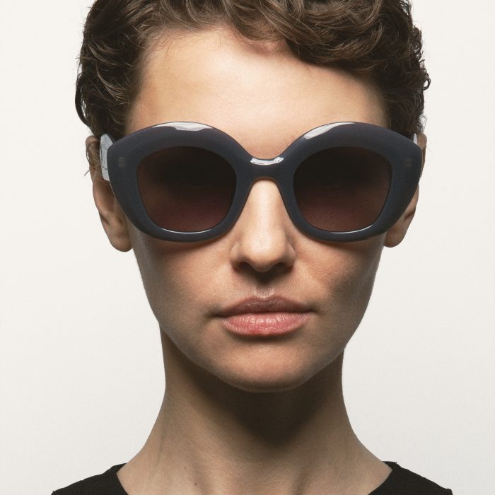 Gafa de sol de forma mariposa con fresado en todo el frontal y varillas de la gafa dando un efecto de volumen. Frontal y varillas de acetato gris. Lente negra degradada base 2 con 100% protección UV y tratamiento antirreflejante. Lente Categoría 3. Plaquetas de acetato incorporadas. Hecha a manO.