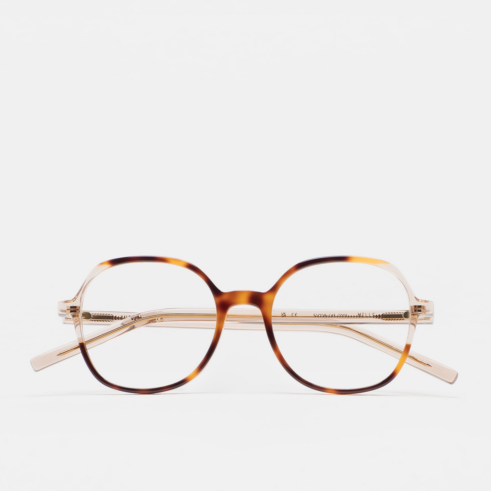 Gafa de ver de forma redondeada. Frontal de acetato high density havana marrón con laminado rosa claro transparente. Varillas de acetato high density rosa claro transparente. Plaquetas de acetato incorporadas. Hecha a mano.