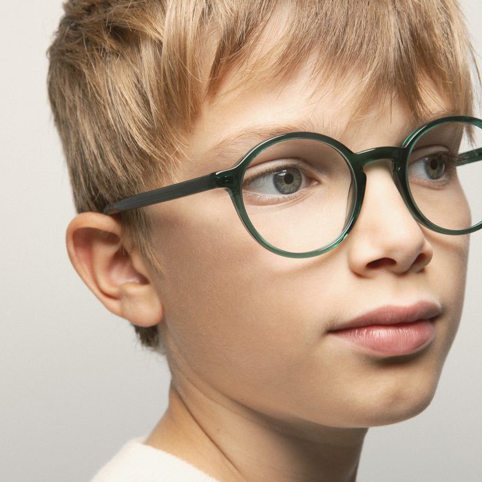 Gafa de ver KIDS de forma pantos. Frontal y varillas de acetato verde transparente. Varillas con terminal beige. Plaquetas de acetato incorporadas. Hecha a mano